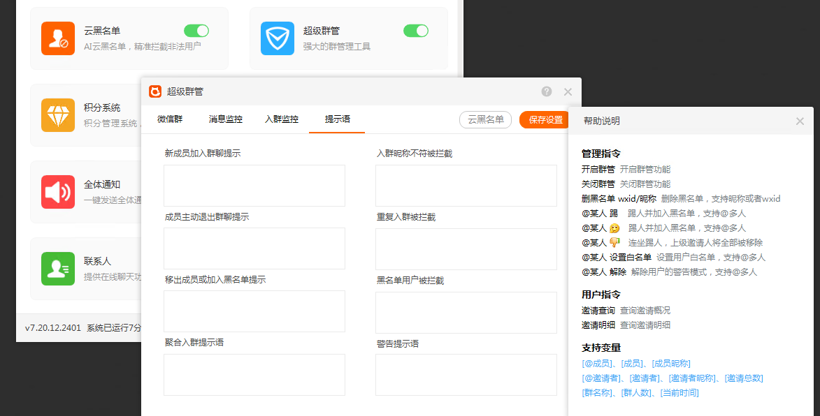设置管理群超多功能,设置群友发图片,发指定文字,发小程序,刷屏炸群自动踢人!设置入群欢迎语,邀请人数统计,踢人提示语等等!管理员 @某人 踢人功能!群消息监控!