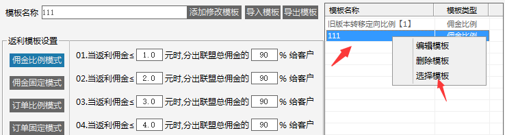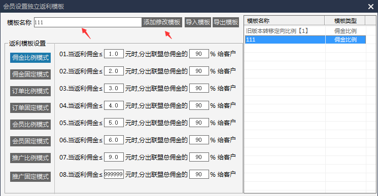 第二步:设置模板名称,设置返利佣金比例,然后点击添加修改模板。