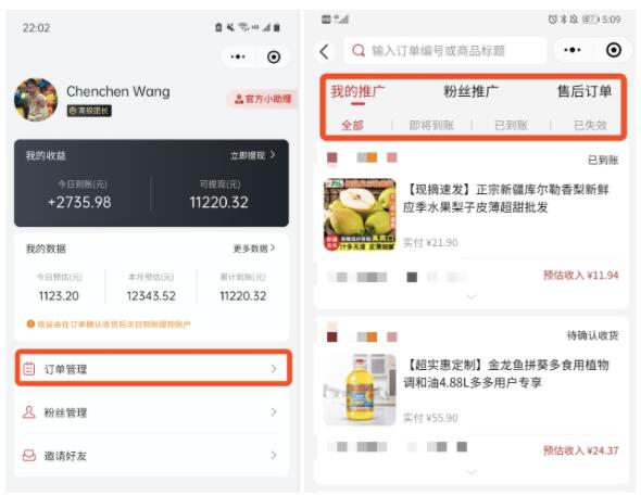 2)查看订单明细:点击个人中心,订单管理,可以看到自己推广的订单、代理推广的订单及售后订单,还可以通过订单状态筛选。