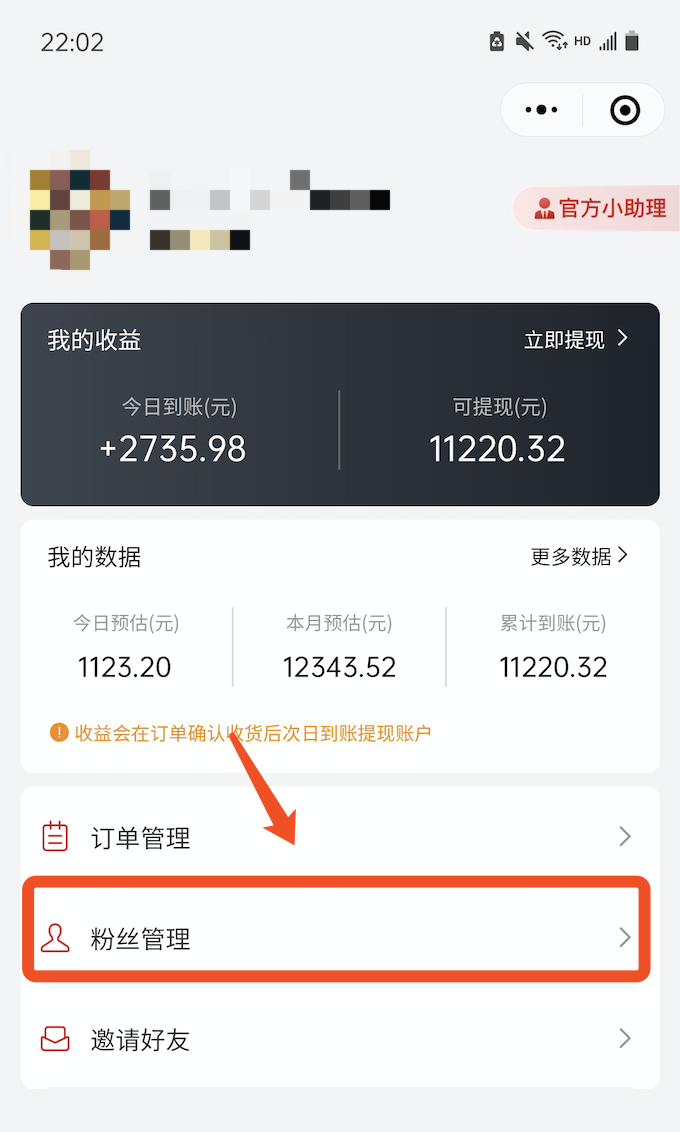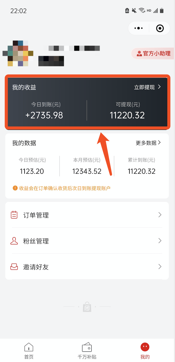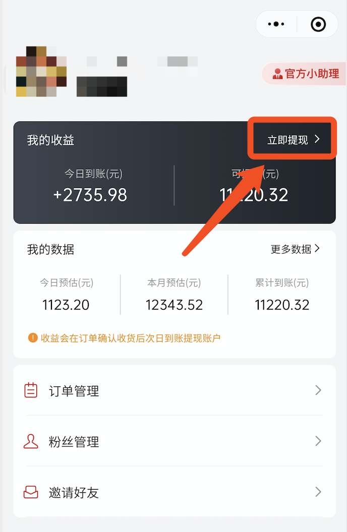1)查看今日到账及可提现金额:点击个人中心,最上方可以看到今日到账金额,和当前可提现金额,今日到账是指,昨天确认收货的的订单佣金,今天可以提现。