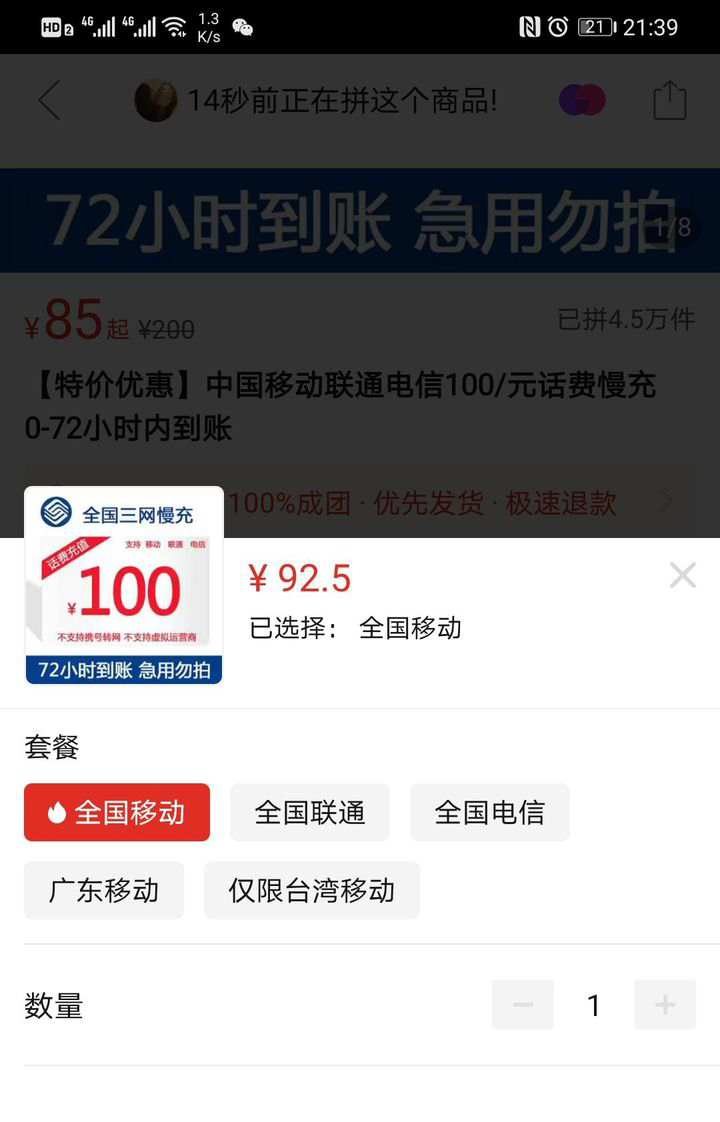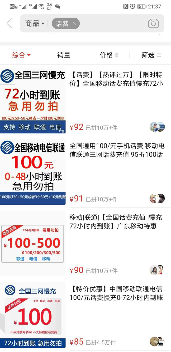 偶尔看到有微商宣传95元充100元话费,我也充过几次刚开始没在意以为是微商偶尔领到的优惠券,所以优惠打折。但是后来发现每次充值他都有,这就很很奇怪了。于是我就去某多多上搜了一下,果然还是这个平台接地气!