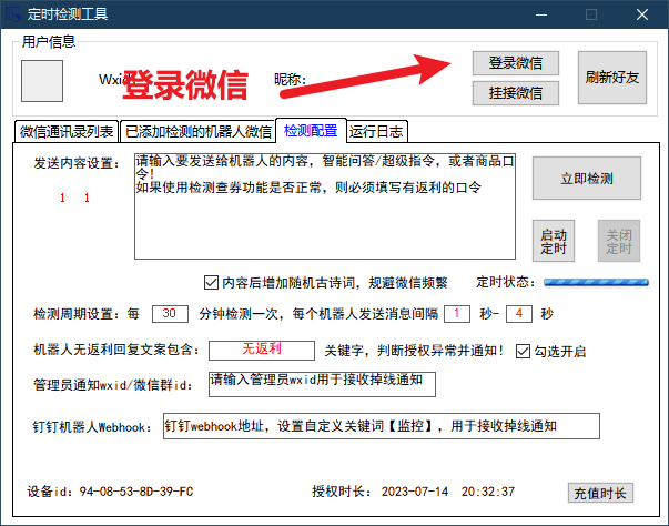 新用户试用7天,下载后解压,启动定时检测工具,工具采用模拟查券检测,需单独准备一个微信号,该微信号需添加被检测机器人微信好友(或采用挂接机器人微信,挂接微信需添加其他机器人微信),方能正常使用。