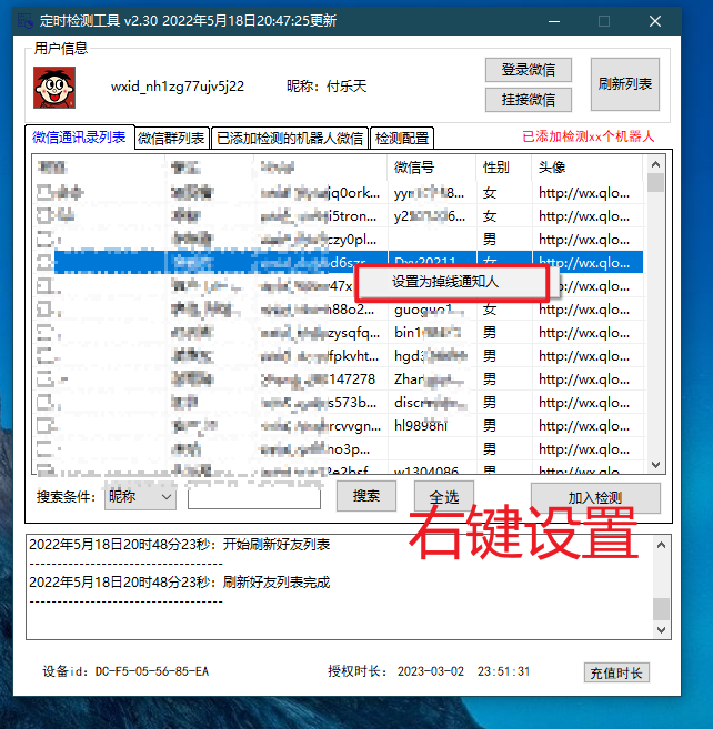 登录后,可直接获取微信群列表,设置微信所在的群为掉线通知群。