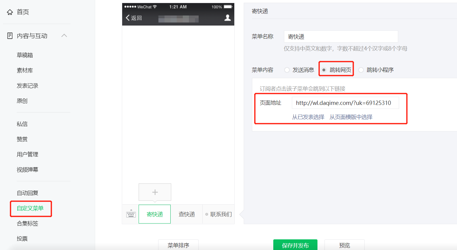 在公众号后台→内容与互动→自定义菜单→输入菜单名称、内容及页面地址。