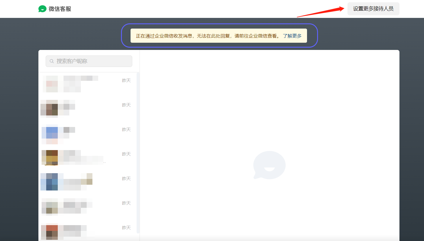 4.点击客户咨询消息→进入客服工作台→右上角点设置更多接待人员→用企业微信扫码新增客服人员