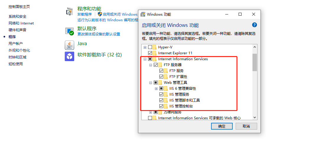 找到“Internet Information Services”展开,勾选 “FTP服务”“web管理工具”。点击确定 等待安装。