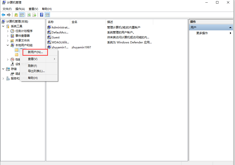找到”本地用户和组”,鼠标放到用户上右键“新用户”。