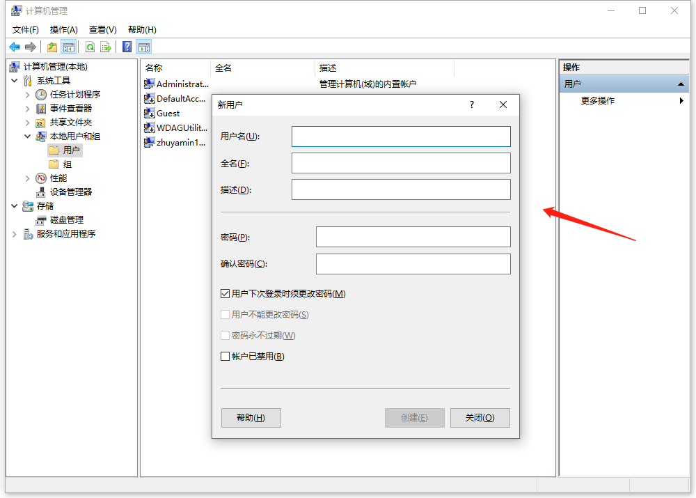 在打开的“新用户”界面,输入用户名和密码,点击“创建”按钮创建新用户。