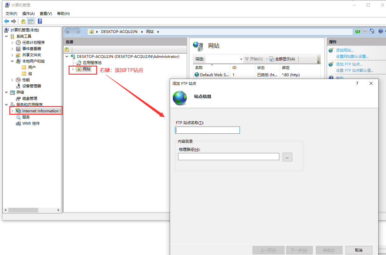 此时,将进入FTP站点添加向导。向导将要求填写FTP站点名称和内容目录、物理路径,FTP站点名称可以自定义填写,FTP内容目录也可选择任意文件夹。