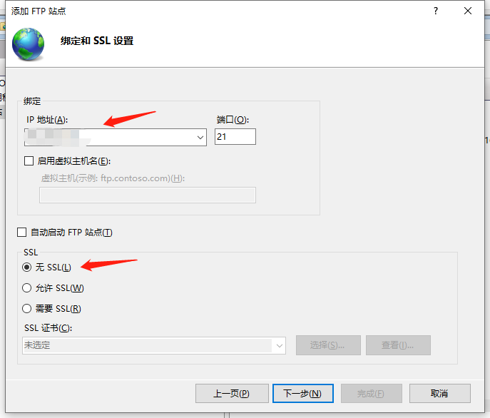 回到FTP站点添加向导,设置绑定和SSL。IP地址栏输入刚刚查到的IP地址,端口:21,启用虚拟主机名项可以不勾选,自动启动FTP站点可以勾选,SSL可以选择无SSL,操作完成后点击下一步;