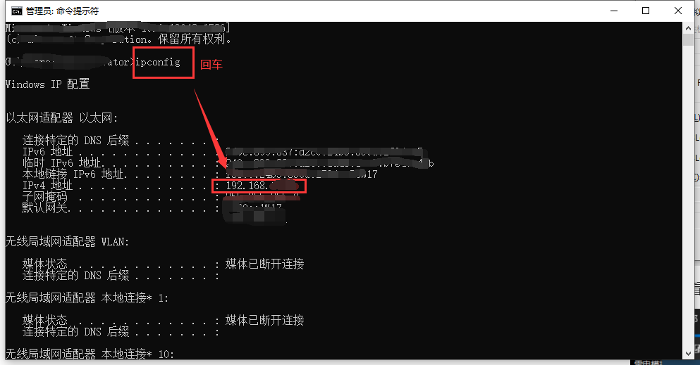 如果没有看到本机ip可以打开命令行输入“ipconfig”查询本机ip地址。