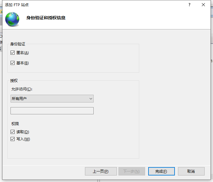 接下来FTP站点添加向导将要求填写身份验证和授权信息,勾选身份验证下的匿名和基本两项前的复选框,允许访问项设置为所有用户,勾选读取和写入权限前的复选框,点击完成。