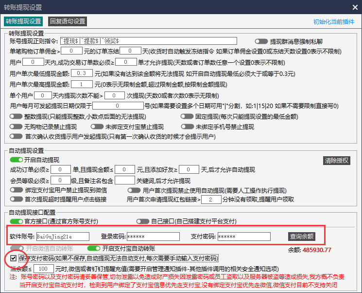 提现的需要使用saas账户密码,勾选保存支付密码框。