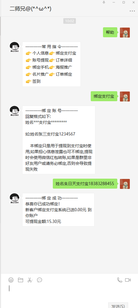 3、向机器人发送“绑定支付宝”可以获得绑定支付宝操作提示。